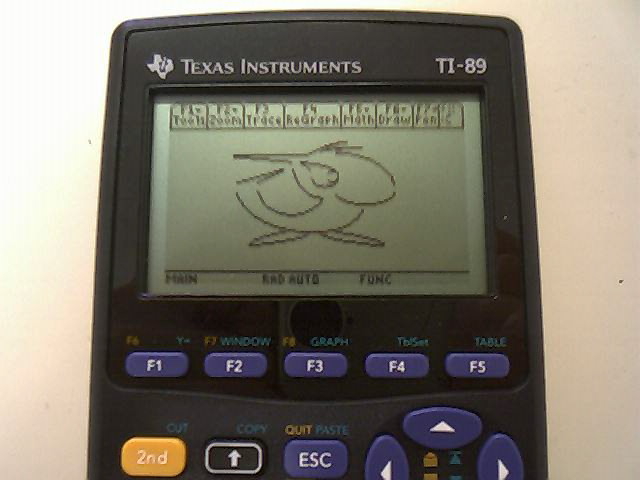 | グラフ電卓はその手軽さから、アメリカの学校などで広く使われているそうで、 日本でも一部の高専や高校などで使われています。 高専での実践例として、グラフに親しむために 関数のグラフを使って絵をかくというのがあります。 そこで、私はシャオロン(中日ドラゴンズのマスコットキャラクター)を グラフ電卓で描いてみました。 |